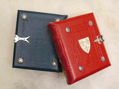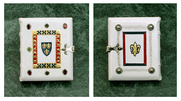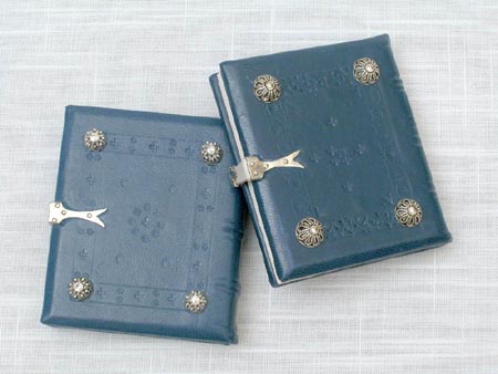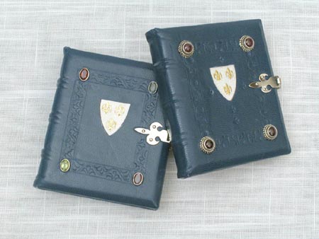 These two books were made on private commission. Genuine 23k gilding on most pages, walnut wood, colored leather, hand made Nickel Silver & Leather Clasps, Sterling Silver Bosses set with genuine Gem Stones, genuine parchment end-leaves, front inlay and spine liners, linen sewing. |