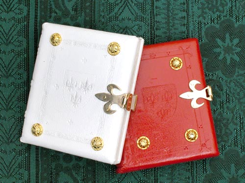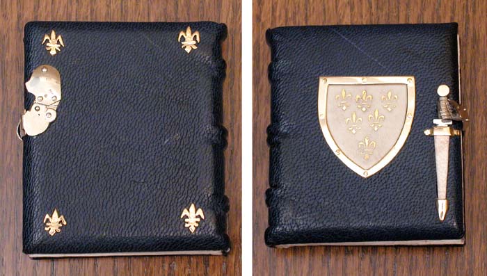 The bindings of hardwood are also of a 15th c. French Gothic type of construction and sewing. The sewing was done with linen thread on a medieval type sewing frame. The ultra thin leather coverings were hand tooled with gothic designs. Each book is slightly different. The binding colors and embellishment vary. I have made only these seven reproductions so far because it is very time consuming. I will make more, but it is unlikely that I'll make very many. This ncludes a hand-made metal & leather clasp, genuine parchment end leaves, and the interior being carefully hand-gilded with 22 or 23k gold leaf throughout. |