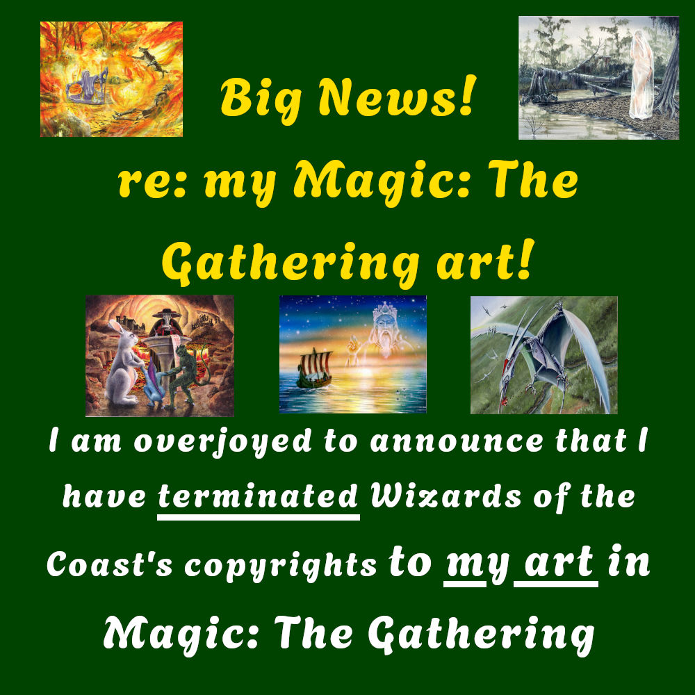 Meanwhile- Prints and existing originals are always available. My web page shows which Artist Proof cards are available on demand, without art commission on them. I have a major project I have to finish before I am back working on my art commission wait list. When that is done, maybe even sooner, I'll try to paint a few A.P. art cards the way I want them (not commissions) and put them up for auction. That will continue while I finish my book Secrets of Forgotten Masters. *When "SoFM" is done, that's when I will be back on commission work. I'll start by contacting folks on the wait list, and after those I will open up to new commissions. Timing? I have no idea. There are just too many variables. I will mak announcements here and my FB pages, and the M:TG Art Groups on FB well before I open up to opening up to add more people to the commission wait list. So the best you can do is keep paying attention to the applicable ONLINE groups on FB, my pages on FB, and check this page on my web site for updates.